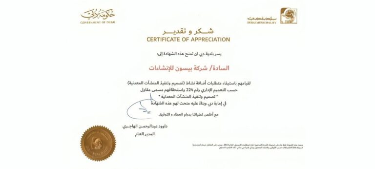 Certificate of appreciation by Dubai Municipality due to record of satisfactory services and obtaining Design and Build Certificate.